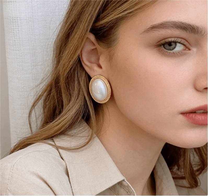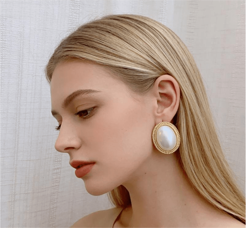 Each earring is meticulously crafted from high-quality zinc alloy and PP, ensuring durability and a lasting, luxurious gold finish on the braided frame. The design features a large, lustrous oval pearl at the center, framed by an intricate gold braided border that adds texture and depth to the piece. The earrings measure 6CM in size, making them a statement piece that is both elegant and comfortable to wear. The color is as shown in the product image, a soft, iridescent white pearl with a rich gold frame that complements a wide range of styles and occasions, from everyday casual wear to formal events like weddings and galas.
