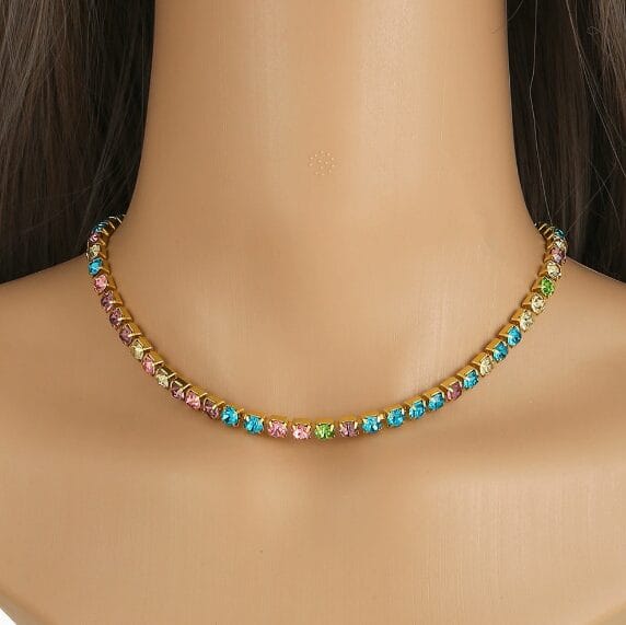 Our rainbow rhinestone choker necklace is designed to captivate and drive sales for your retail business or Amazon store. This eye-catching piece features a continuous line of multicolored rhinestones set in a gold-tone zinc alloy frame, creating a luxurious, high-fashion look that complements any outfit. Whether your customers are dressing up for a festival, a night out, or adding a pop of color to their everyday style, this necklace is a versatile must-have that will fly off your shelves.